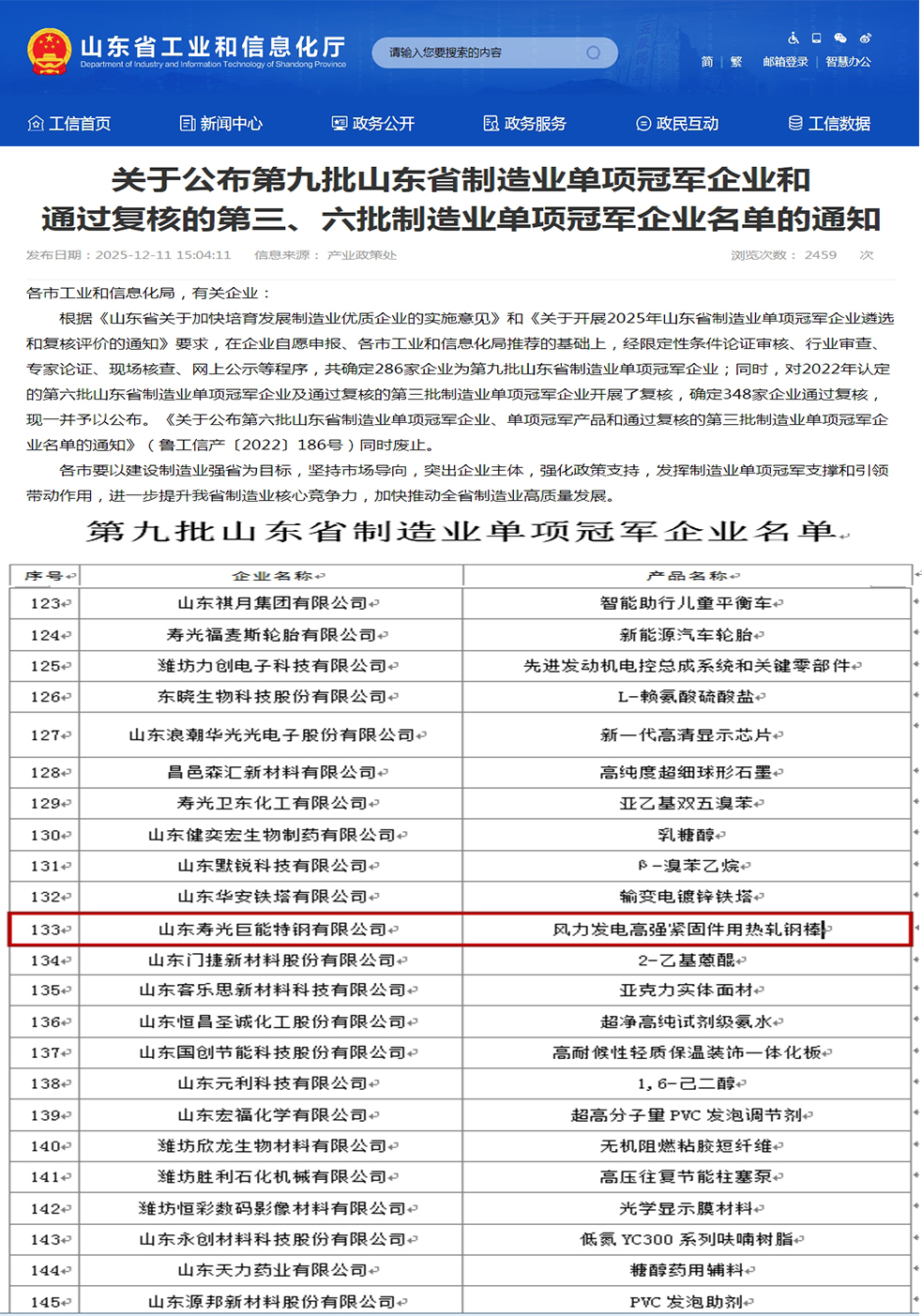 公司高碳铬轴承钢入选2025年“山东制造 鲁链优品”名单(第一批)